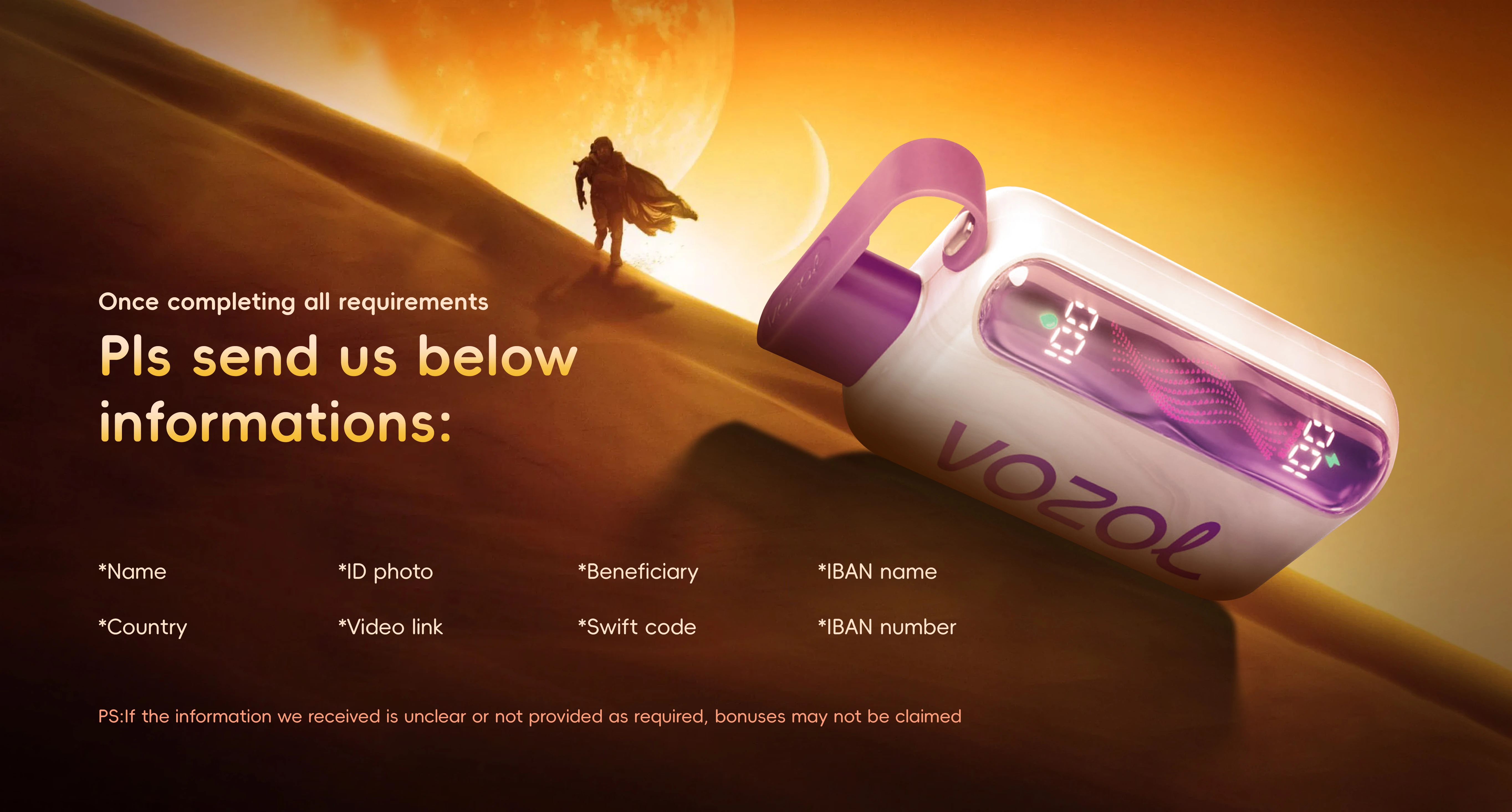Name+country + ID photo (to prove that you are an adult) + video link + Beneficiar + swift code + IBAN name + IBAN number.